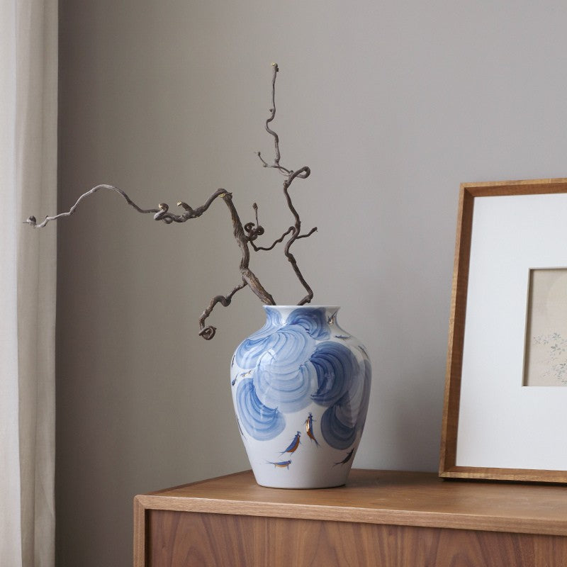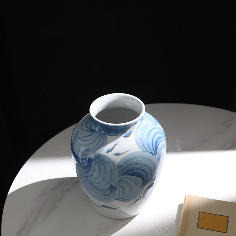 Hand-Painted Blue & White Koi Vase | Artisan Gilded Porcelain Art